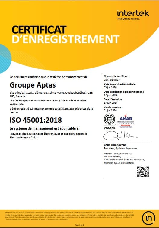 Cette division du Groupe Aptas est approuvée par le Bureau de la qualification des recycleurs de l’ARPE pour récupérer et recycler le matériel électronique et informatique désuet. À titre de rappel, l’ARPE-Québec est l’organisme mandaté par RECYC-Québec pour gérer le programme québécois de recyclage de matériel informatique et électronique.