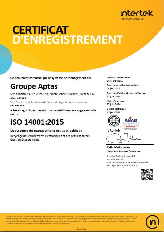 Environek offre un moyen simple et gratuit de récupérer et recycler vos équipements électroniques et informatiques de façon sécuritaire et écologique. Nous nous assurons d’éliminer les données personnelles qui peuvent être restées sur vos appareils et ce, en toute sécurité. La division Environek du Groupe Aptas possède les certifications indiquées dans la section Nos certifications ci-dessous.